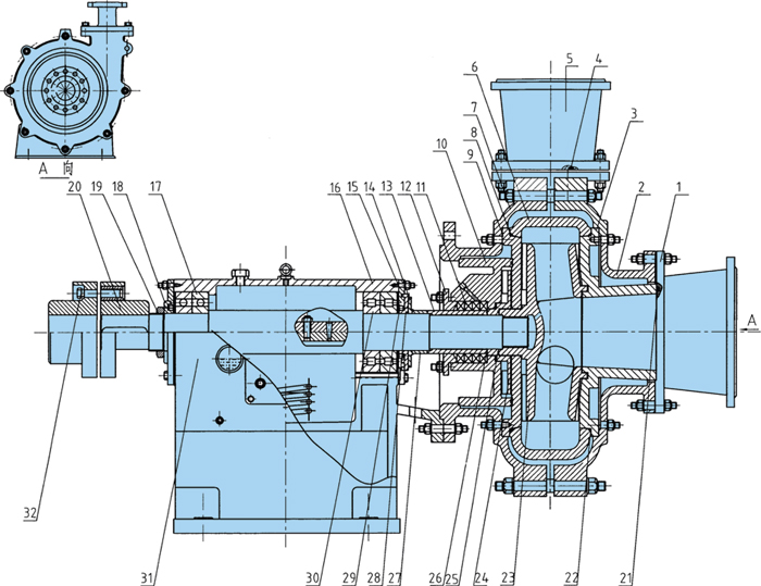 1、入口短管 2、前泵盖 3、前护板 4、O型橡胶密封圈 5、出口短管 6、护套 7、后泵盖 8、O型橡胶密封圈 9、后护板 10、填料箱 11、油浸石棉盘根F19 12、填料压盖 13、轴套 14、拆卸环 15、轴承压盖 16、轴承上盖 17、向心推力球轴承 18、甩水环 19、拼冒 20、联轴器 21、O型橡胶密封圈 22、O型橡胶密封圈 23、叶轮 24、副叶轮 25、0型橡胶密封圈 26、O型橡胶密封圈 27、调整套 28、甩水环 29、骨架油封 30、短圆柱滚子轴承 31、4号泵座 32、弹性具销